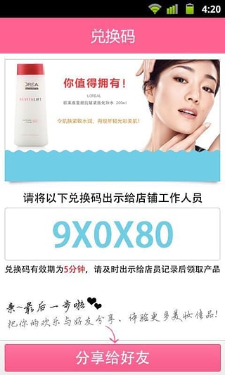 4、获取成功后,将领取码出示给店铺人员记录,换取正装产品试用。领取成功后千万记得分享给好友哦!我们鼓励用户分享真实体验,每次分享都能获得积分奖励,可用于兑换更多优质产品。专业的美容顾问还会根据您的试用反馈,提供个性化的护肤建议。