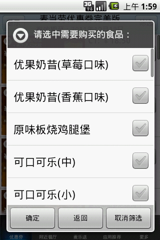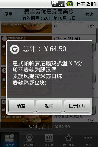 1、功能设计完善,使用体验流畅;2、优惠券过期自动提醒更新,确保你总能使用最新优惠;3、可根据需要选择性下载优惠券,避免占用过多存储空间;4、提供智能筛选功能,通过输入想吃的食品就能快速找到对应优惠券;5、选好优惠券后,点击显示图片给服务员查看即可,支持手势缩放操作;6、内置"附近餐厅"功能,能快速定位周边麦当劳门店;7、参与"免费麦当劳"活动,完成简单任务就能获得免费食品兑换券。