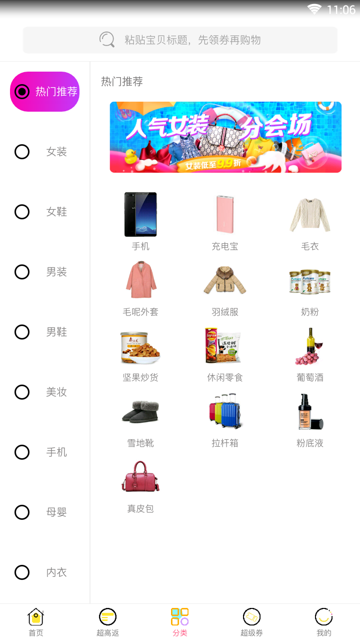2.按各个产品分类进行搜索,可以快速找到目标品类的最新优惠活动。分类导航清晰明了,涵盖服饰、数码、家居等数十个细分品类。