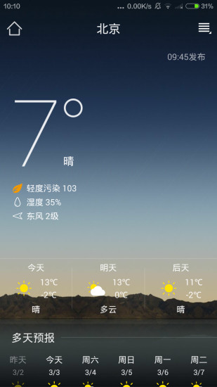 2、节省流量:智能网络管理功能,仅在更新或查询天气预报时启动网络连接,其余时间自动关闭,有效节省流量,是一款环保绿色的实用工具。