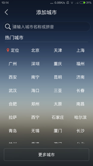 4、查询城市:支持全国市、区、县城市的天气查询,为您提供未来一周的天气预报,帮助您提前规划行程,应对天气变化。