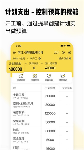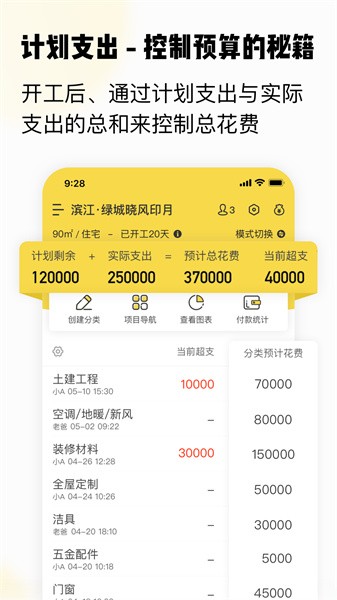用户可以设置整体装修预算和各项细分预算,系统会实时监控支出情况,当某项支出接近预算上限时自动提醒,有效避免超支情况发生。