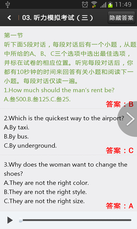 (2)高考听力模拟考试。真人发音的清晰度、语速及试题难度都与高考真题基本一致。提供完整的听力考试流程模拟,包括试音、题目间隔等细节都高度还原。