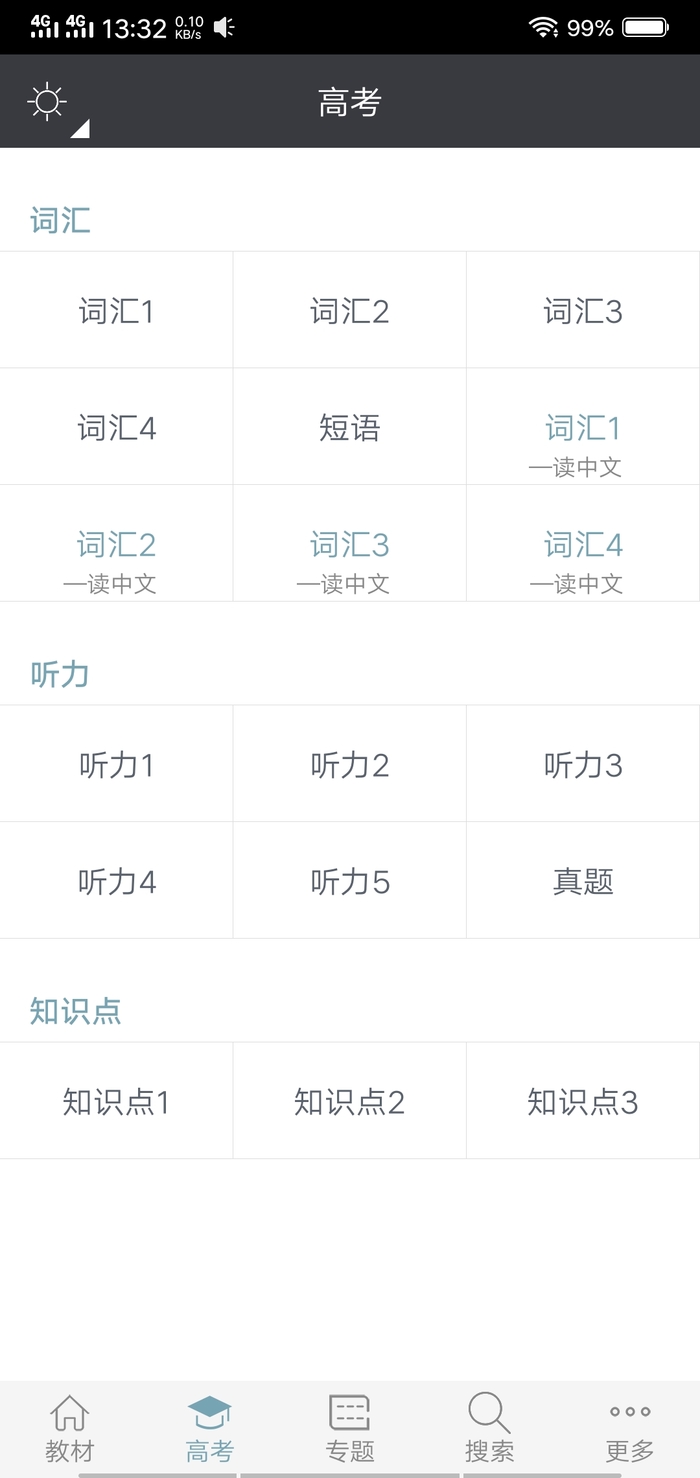 (1)高考核心大纲3500词,真人高清发音,可跟读、可点读。词汇按考频分类,重点突出高频考点词汇,配有真题例句,帮助掌握词汇用法。