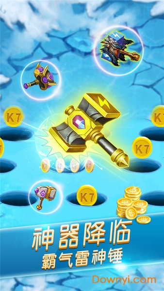 玩家可以从多种造型各异的锤子中选择自己喜欢的款式,用来敲击冒头的地鼠。游戏界面上方设有两种能量条系统,使用不同锤子击中地鼠会积累不同比例的能量值。当金色能量条蓄满时,会触发特殊的金币场景,在这个场景中打击金币不会消耗任何资源。而蓝色能量条蓄满后则会激活强大的雷神之锤技能,可以对全屏范围内的地鼠造成一次性打击。