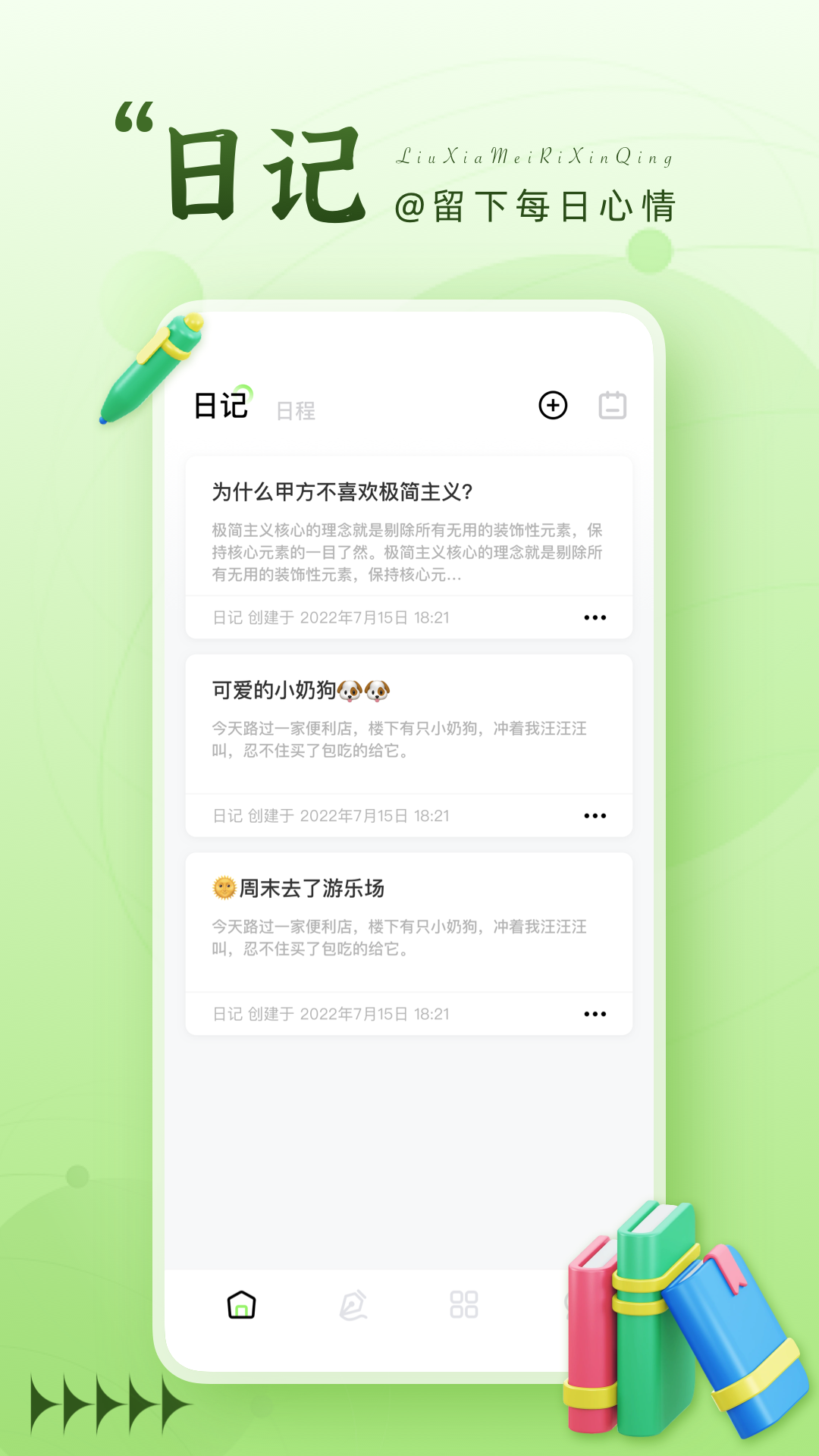 【日记】精美的日记记录界面,支持图文混排和心情标签,让您完整保存生活中的美好瞬间和情感体验。