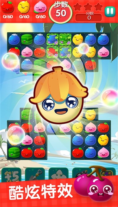 巧妙设计的关卡,丰富的内容,没有任何的规律可循,不同的关卡带来不同体验。每个关卡都有独特的目标要求,有的需要收集特定水果,有的要在限定步数内完成,还有的会出现特殊障碍物增加挑战性。