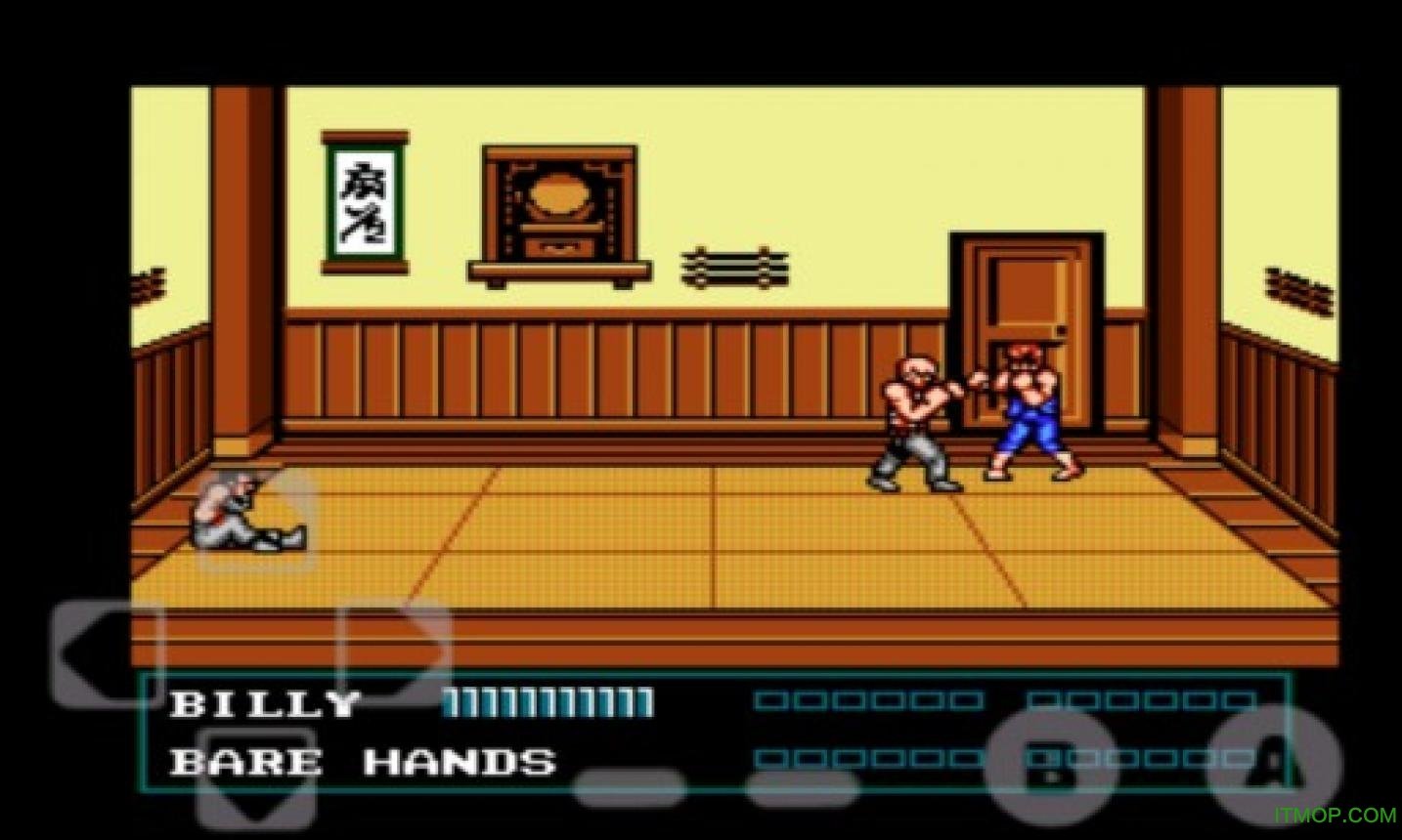 游戏采用经典的AB键组合操作方式:面向右侧时B键出拳,A键踢腿;面向左侧时操作相反。同时按下AB键可实现跳跃动作,在跳跃至最高点时按下A或B键可施展标志性的"旋风腿"绝技。游戏还设计了丰富的连招系统:落地瞬间下蹲状态出拳可触发"上勾拳",此时同时按下AB键可施展"飞膝"攻击。对战小兵时,将其打到捂腹状态后可进行擒拿,随后可通过方向键+拳键组合实现背摔或上踢等多样化的终结技。这些精心设计的操作方式既保留了街机原版的精髓,又针对手机触控进行了优化。
