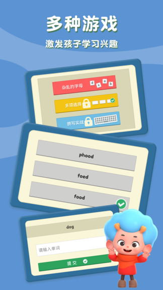 大声朗读功能通过AI语音识别技术,实时纠正发音,有效锻炼孩子口语能力。个性化定制系统允许孩子选择12种不同的动物头像和多彩的昵称样式,增强学习归属感。三种趣味游戏模式包括"单词接龙"、"拼写竞赛"和"记忆挑战",通过游戏化设计持续激发学习兴趣。独特的进度追踪系统会记录每个单词的学习情况,智能安排复习时间。家长控制面板让父母可以设置每日学习时长,查看学习报告,确保学习效果。
