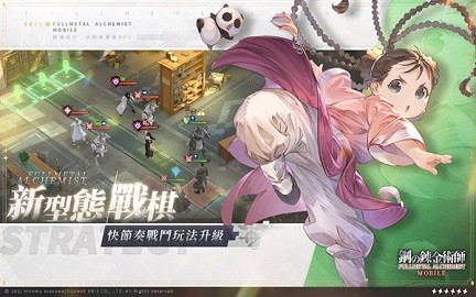 角色立绘由荒川弘监修,Q版模型保留原作特征。战斗场景采用多层卷轴设计,背景细节呈现炼金术文明特色。
