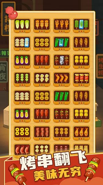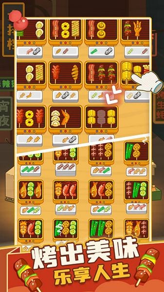 核心玩法是连接三个或以上相同烤串进行消除。注意观察烤串排列,优先消除能引发连锁反应的目标。长按烤串可以查看详细信息,合理规划消除顺序能事半功倍。
