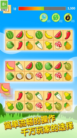 2、玩法超容易,只需连线2个及以上的同色水果就可以消除;游戏采用直观的触控操作,支持直线和折线两种连接方式,还贴心地设置了提示功能。新手教程简明易懂,三分钟就能掌握所有规则,特别适合亲子互动或朋友间休闲竞技,轻松享受消除快感。