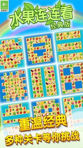 3、高品质高设计感的游戏水准,瞬间高大上;开发团队在UI交互、音效配乐等方面精益求精,采用物理引擎模拟水果消除时的弹跳效果,搭配轻快的背景音乐和拟真音效,营造出媲美主机游戏的品质感,让简单的连连看玩法焕发全新魅力。