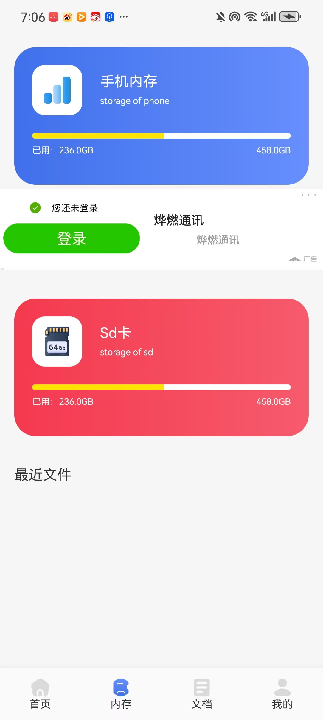在首页,用户可以直观查看手机内存及SD卡的存储情况,包括已用空间和可用空间,让内存管理一目了然。此外,系统还会智能展示最近访问的文件,方便用户快速查找和使用。