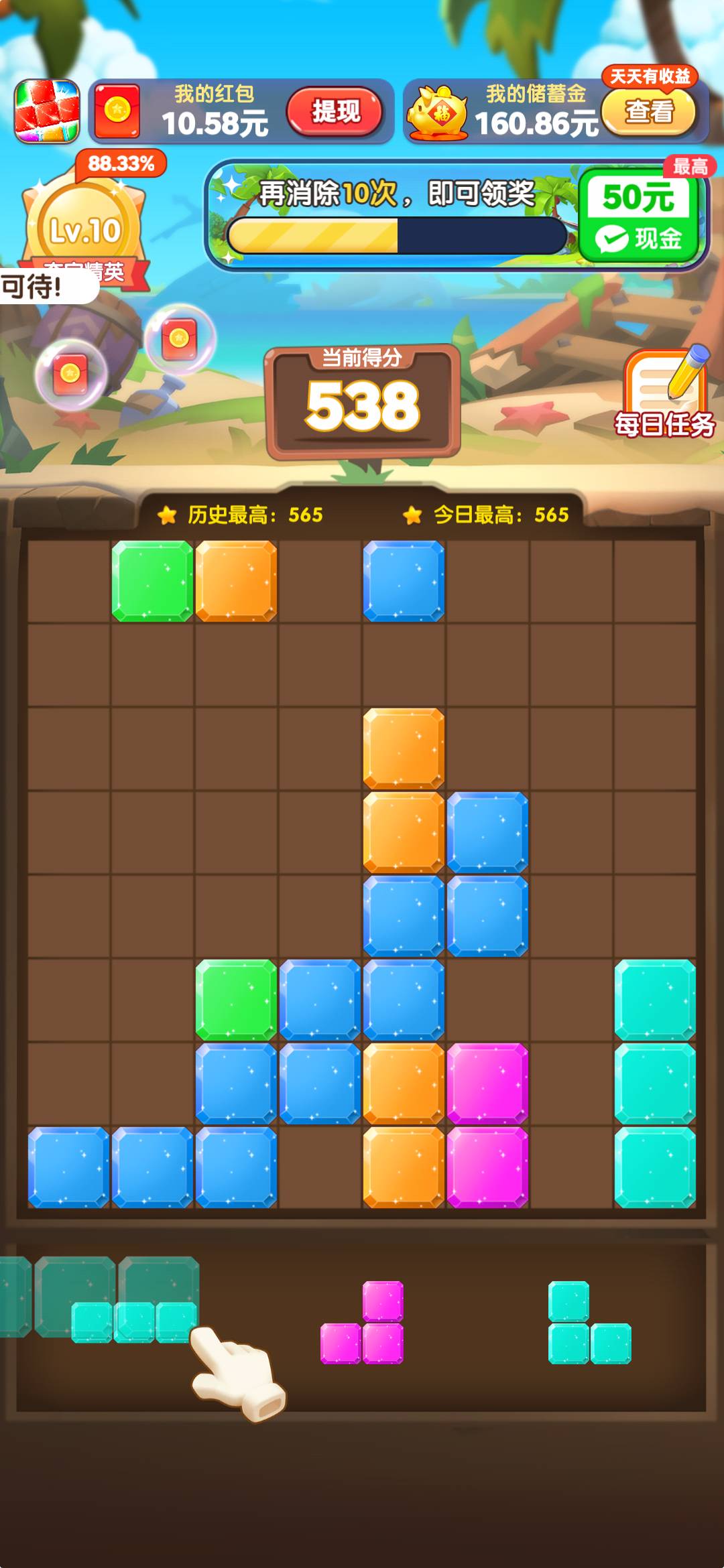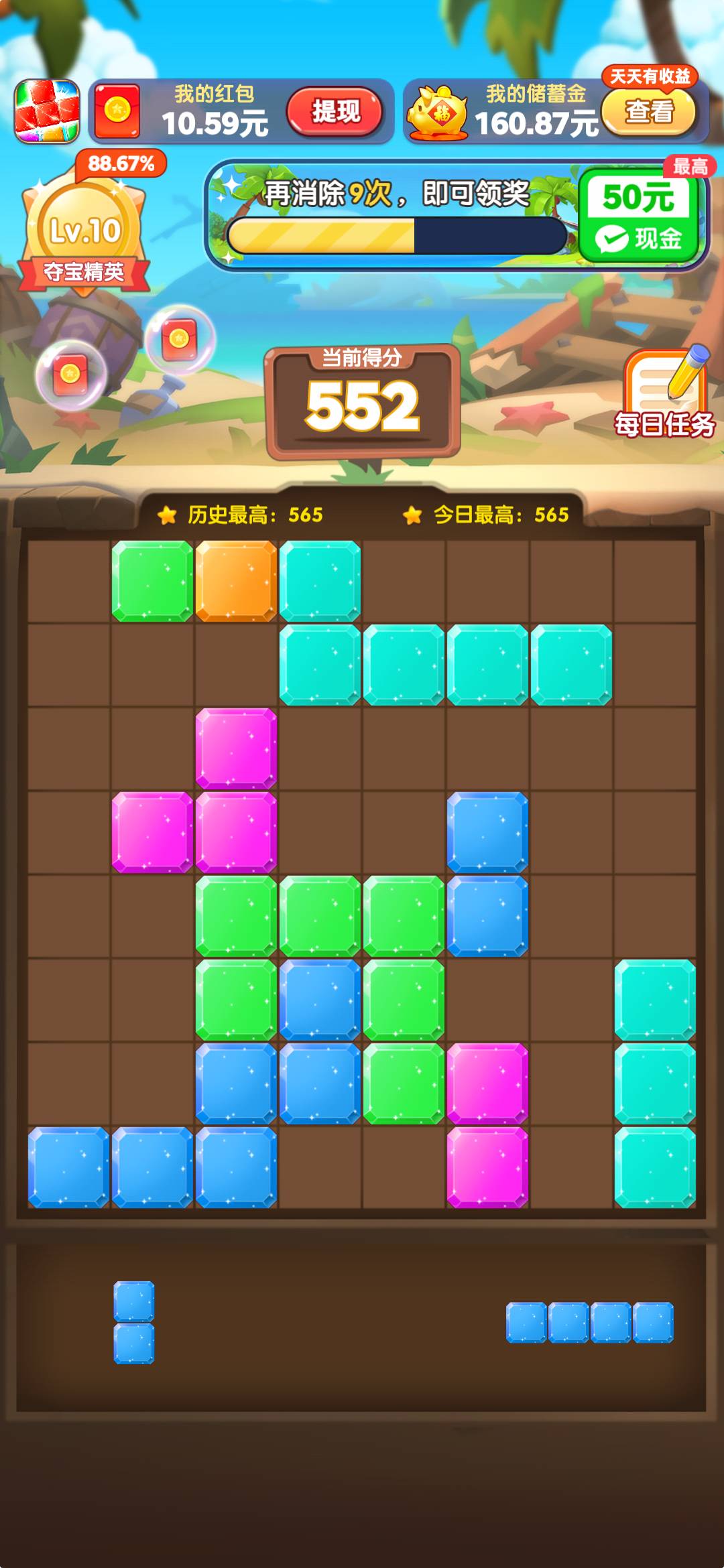 夺宝大师领红包是一款趣味十足的休闲消除游戏,融合了红包奖励和闯关玩法。游戏采用经典的三消机制,玩家需要通过智慧与策略完成各种挑战任务。随着关卡推进,难度逐渐提升,但奖励也更加丰厚。独特的双奖励模式让玩家既能享受游戏乐趣,又能获得实实在在的红包收益。精美的游戏画面搭配轻松愉悦的背景音乐,为玩家带来沉浸式的消除体验。无论是想打发时间还是赢取奖励,这款游戏都能满足你的需求。