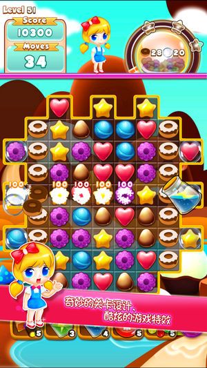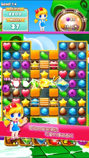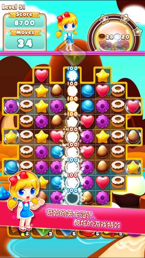 新的糖果梦幻世界全新的丰富冒险等你享受,从巧克力瀑布到棉花糖云朵,场景美轮美奂;2、经典的消除,最具创新玩法融入多彩元素等你分享,包括限时挑战、无尽模式和好友对战;3、超爽的关卡,各种的大冒险,等你勇闯新的糖果世界。游戏还支持社交功能,可以和好友比拼分数,互送体力,分享游戏乐趣。独特的成就系统记录你的每一个精彩瞬间,收集控们还能解锁各种可爱的糖果精灵。