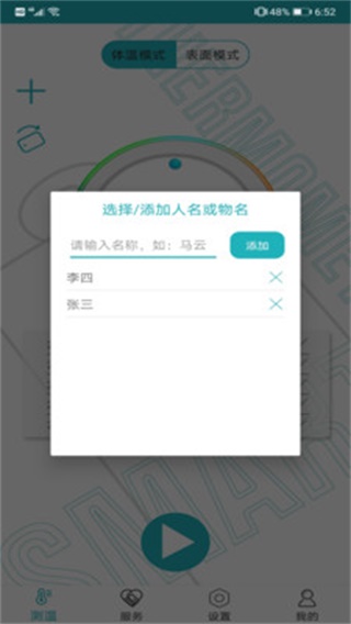 进入首页,选择测温类型并开始测量,还可以添加各种记录信息,完善健康档案;