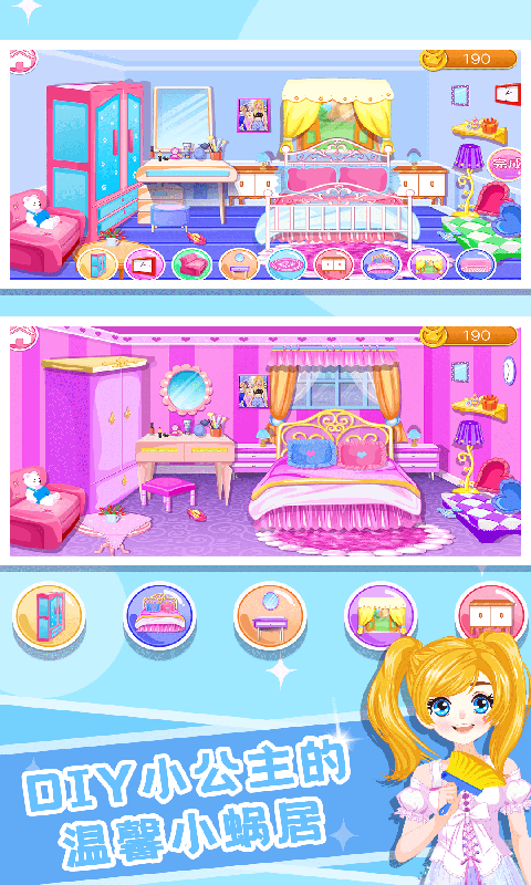 在应用中就能为公主进行装扮房间,便于用户可以高效的体验;游戏操作简单,孩子们可以快速上手,轻松完成房间设计。