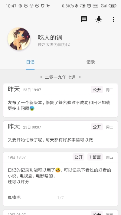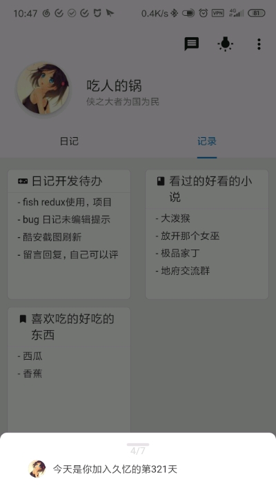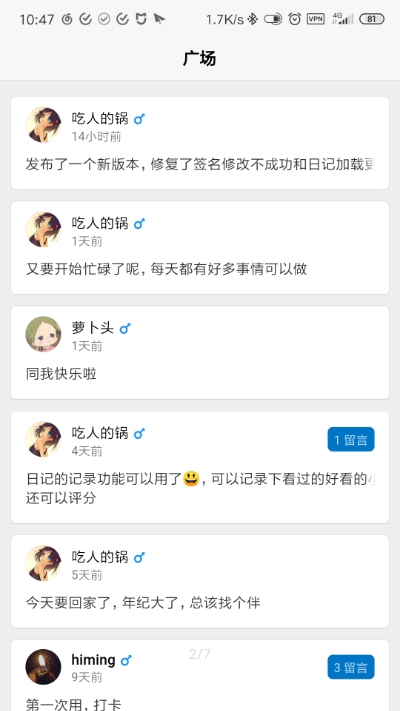 最新版本对图片访问速度进行了大幅优化,现在加载高清图片更加流畅快速。广场展示界面经过重新设计,视觉效果更佳,互动体验更友好。新增日记模板功能,提供多种风格模板供用户选择。修复了若干已知问题,提升了应用整体稳定性。优化了数据同步机制,确保多设备间的数据一致性。新增夜间模式,保护用户眼睛的同时提供舒适的阅读体验。