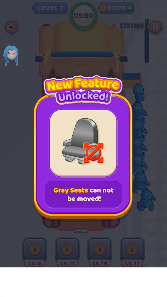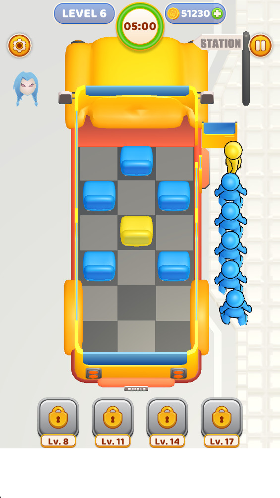 1.让出上车位置来让车外的人上车。游戏采用动态空间管理机制,玩家需要先点击空位角色让其暂时离座,系统会以半透明效果显示可移动范围,此时滑动屏幕就能为新车乘客腾出精准的入座空间。2.通过移动座位来让人上车。长按座位可激活拖拽模式,双指缩放能调整座位视角,巧妙利用对角线移动可以破解看似无解的座位困局,每个成功匹配都会触发角色特有的庆祝动画。3.使用金币解锁新的车。完成连续关卡会获得金币奖励,这些金币不仅能解锁双层巴士、豪华房车等12种特色车型,还能购买季节限定皮肤,比如圣诞主题的麋鹿校车。4.游戏中有非常多的关卡,也有很多道具可以使用,是打发时间的不二之选。目前游戏包含500+精心设计的关卡,从基础教学到专家挑战共分6个难度阶段,特殊道具如"座位旋转器"和"乘客交换券"能帮助突破瓶颈,每日登录还能获得免费道具礼包。