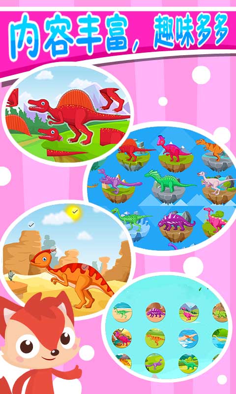 2、新增"恐龙幼儿园"、"化石挖掘场"和"侏罗纪森林"三大学习场景,每个场景包含10个互动知识点和3个迷你游戏。