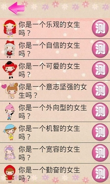 轻松有趣适合了解心理测试和心理测试知识女孩子都喜欢看这些心理测试的东西的而且在一起聊天也可以聊在测测里面看的自己的心理测试什么的。我发现通过讨论测试结果,可以更深入地了解朋友的内心世界,增进了我们的友谊。
