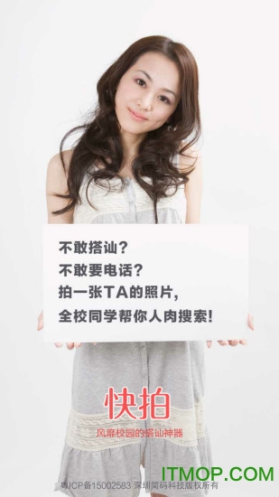 风靡校园的搭讪神器。碰到喜欢的人,不敢搭讪,不敢要电话?拍一张TA的照片,全校同学帮你人肉搜索!