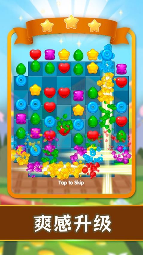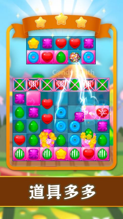 核心玩法是通过滑动屏幕将三个或以上相同糖果连成一线进行消除。五个相同糖果直线排列会产生彩虹糖,可以消除整行或整列;T型或L型排列会产生包装糖,引爆后清除周围区域。掌握这些特殊组合是获得高分的关键。