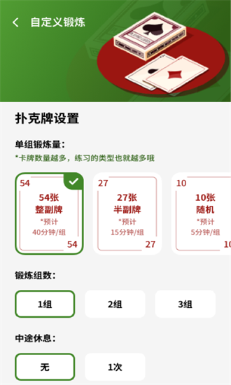自定义锻炼法,不同类型计时法,整副牌高强度训练;半副牌中强度训练,随心定义更适合自己的运动方式!用户可以根据体能状况灵活调整训练强度,从入门级到专业级循序渐进。系统会自动记录每次训练数据,方便追踪进步轨迹。