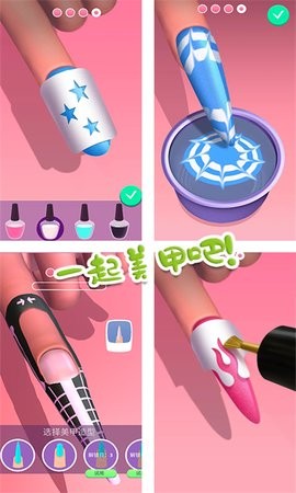 游戏提供超过200种基础甲油颜色和30种特殊质地(如磨砂、珠光、金属漆),搭配动态光影效果,每款美甲都能呈现真实质感。玩家可以自由混色创作渐变效果,系统会自动记录调色配方方便重复使用。