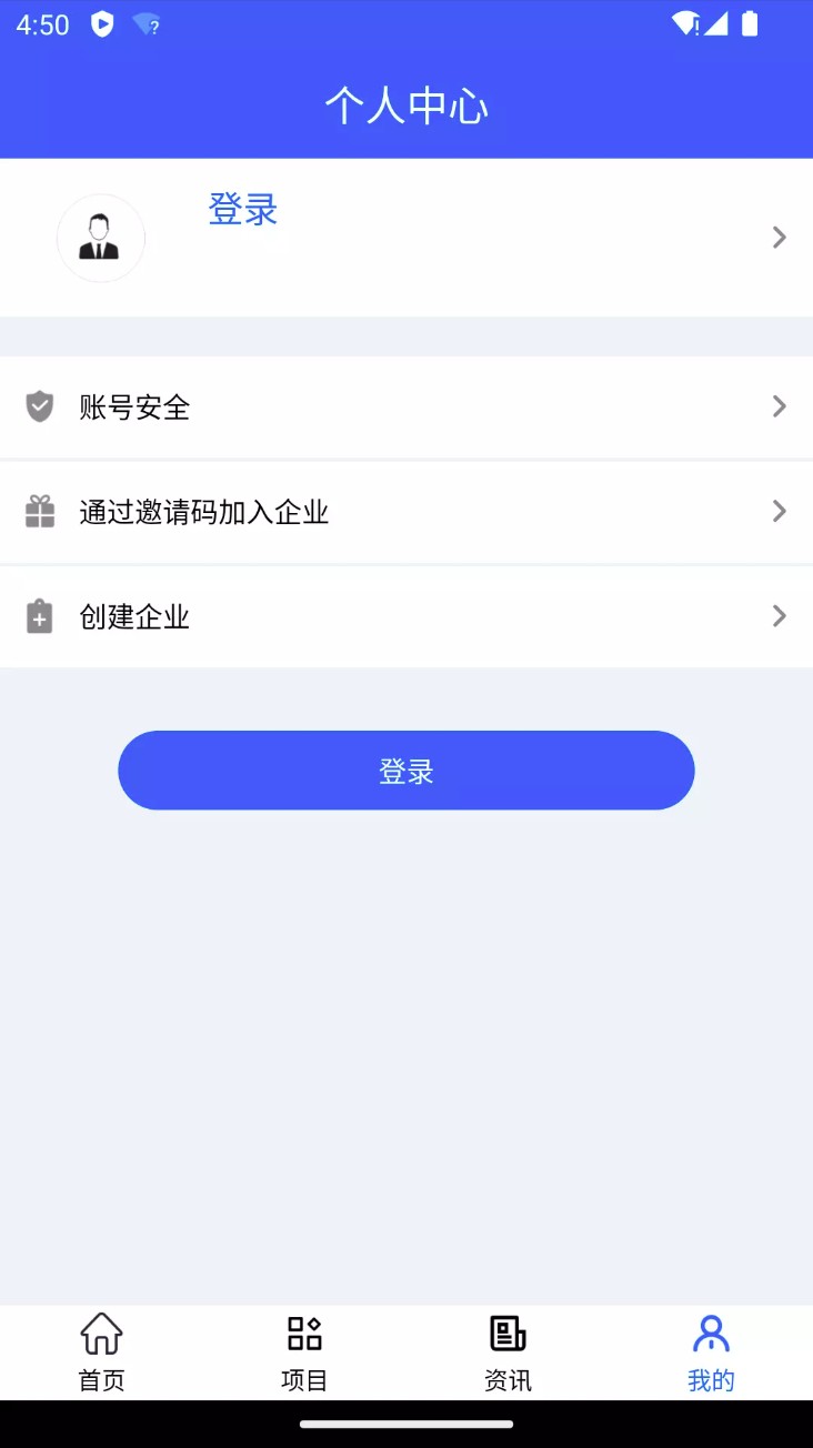4.在"我的"页面可进行账号安全设置、加入企业、创建企业及查看隐私政策与用户协议。