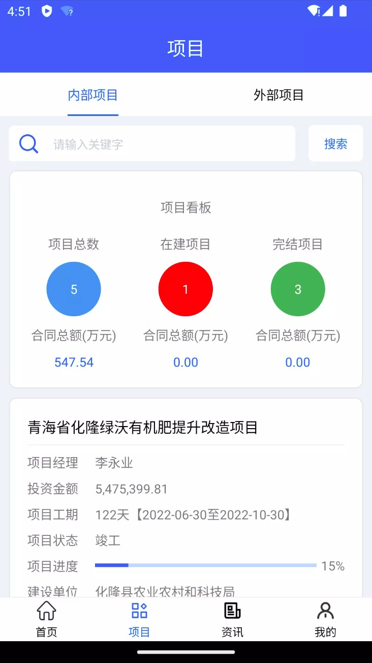 2.底部导航切换到"项目",可选择内部项目或外部项目,并通过搜索栏输入关键词查找。