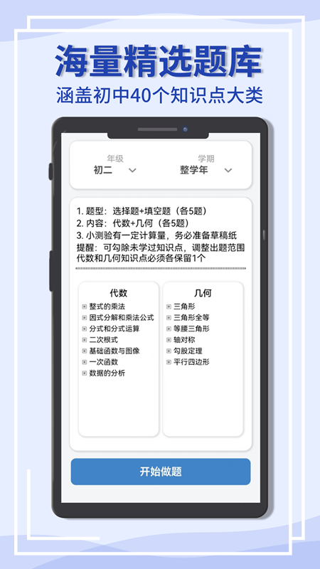 ·海量精选题库:涵盖初中40个知识点大类,满足不同学习需求;