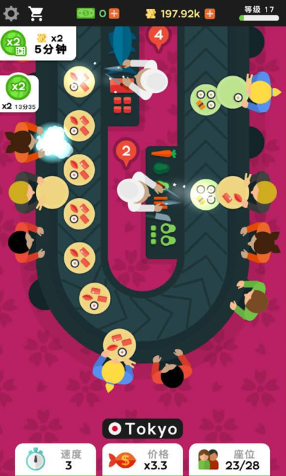 1、从街边小店起步,逐步发展成连锁餐饮集团。玩家需要根据不同城市的消费水平和饮食习惯,制定相应的经营策略,在东京、纽约、巴黎等国际大都市开设分店,打造全球知名的寿司品牌。