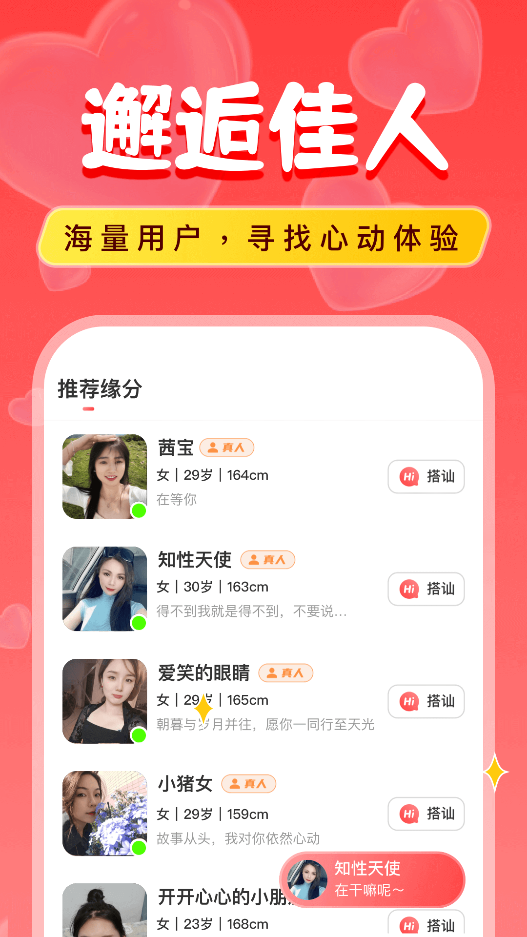 1、从语音聊天开始,你可能会遇到让你一见钟情的TA,通过轻松愉快的对话拉近彼此的距离,开启一段浪漫的心动旅程。无论是深夜倾诉还是日常分享,都能找到共鸣的伙伴。