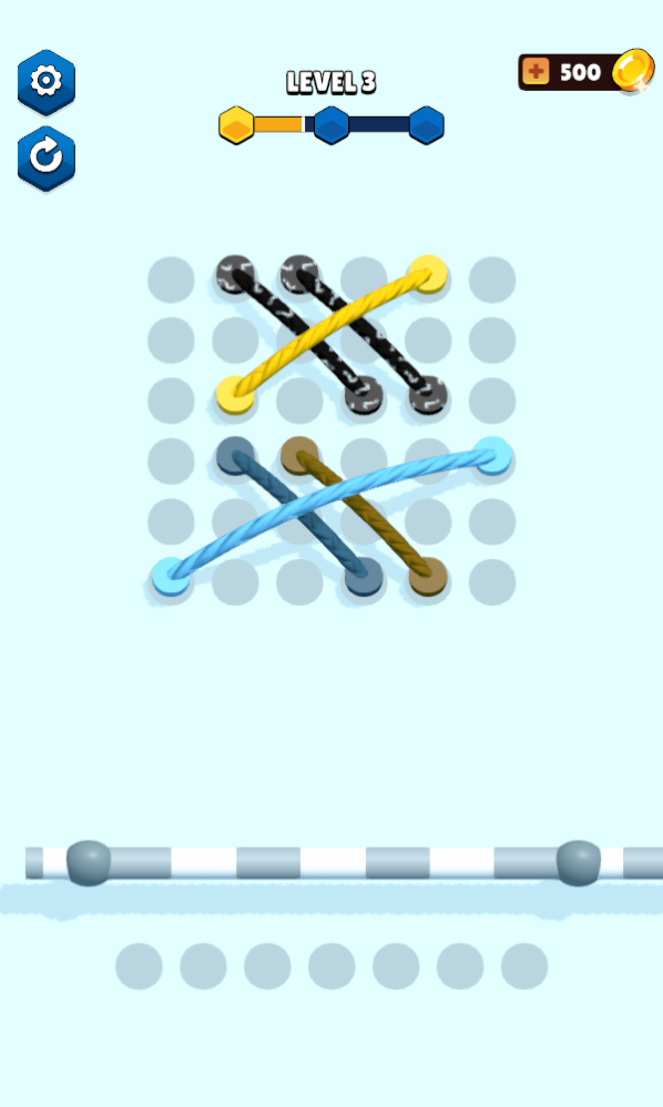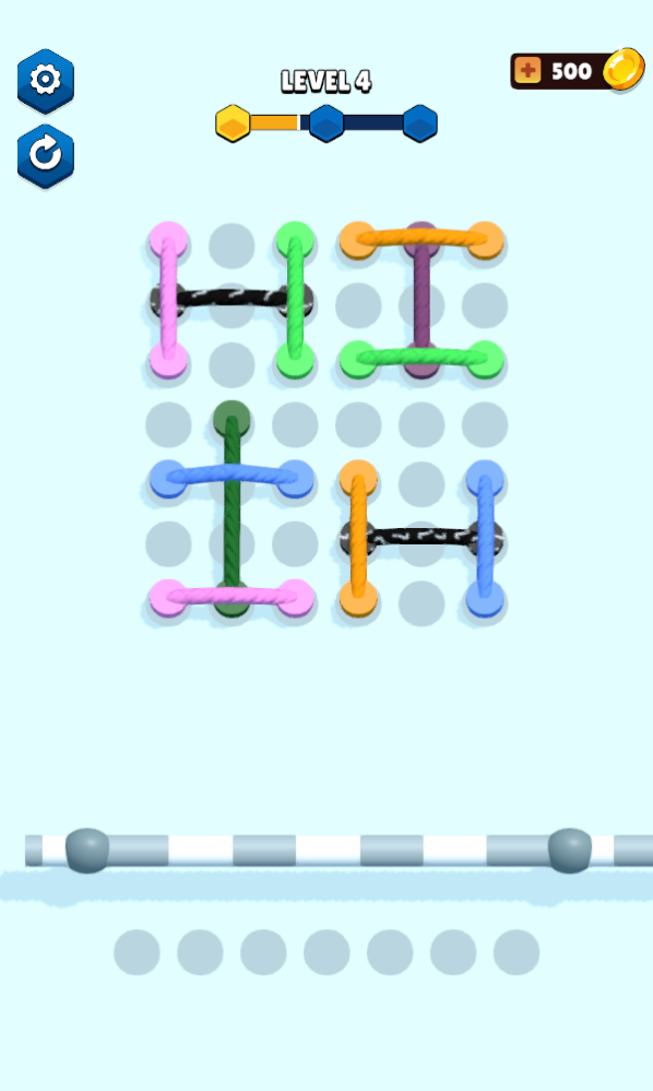 3、操控绳索颜色,与色块匹配,解锁新的游戏元素和挑战模式。注意观察色块分布规律,提前规划绳索移动路径能事半功倍。