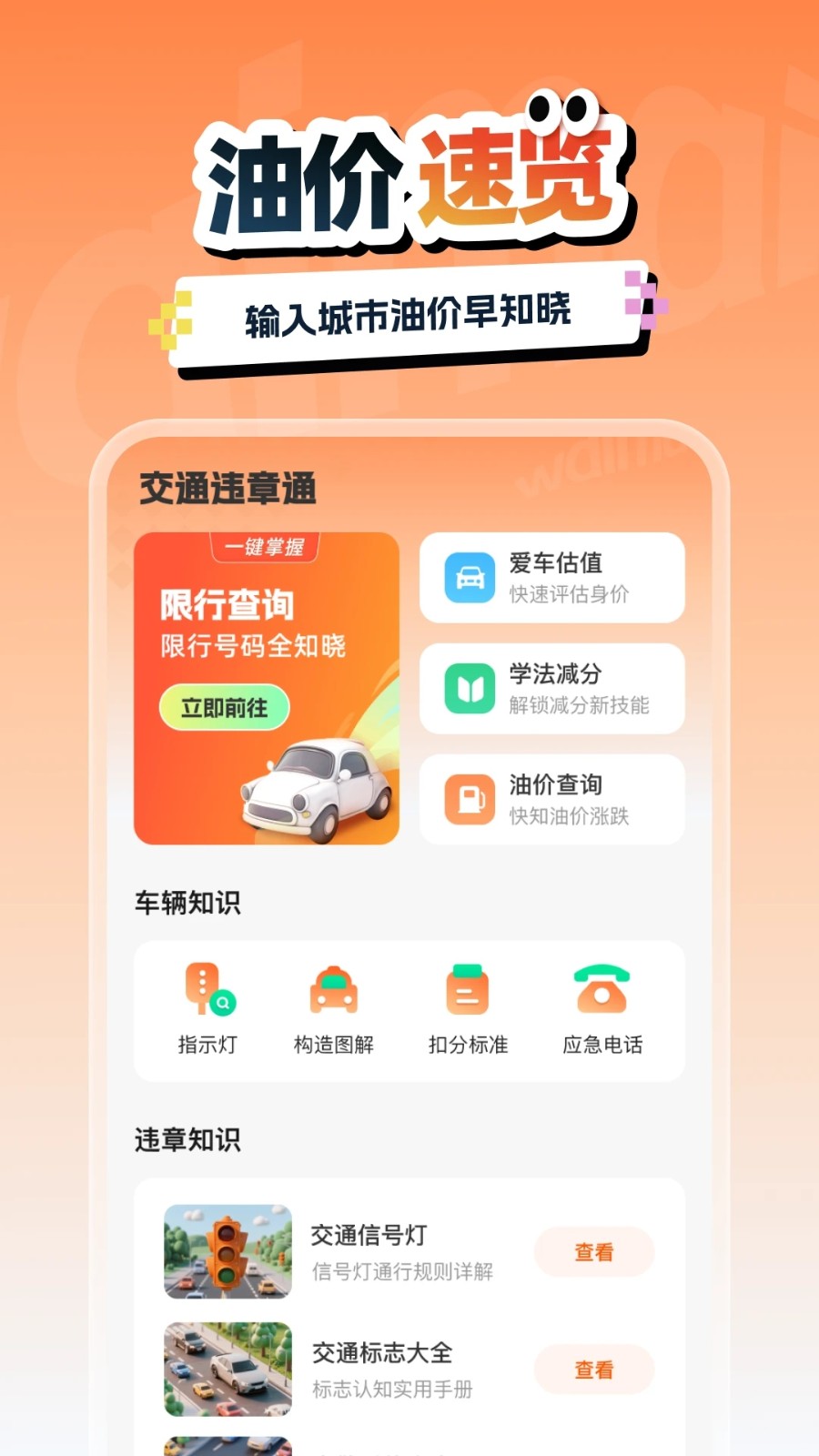 1、软件首页设计简洁明了,用户可快速进入限行查询、爱车估值、学法减分等核心功能模块。特别设置的交通知识学习专区,通过图文并茂的方式帮助用户理解复杂交规,首页还支持个性化城市设置,确保展示的信息与用户所在地区完全匹配。