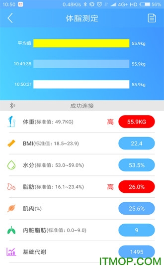 在看到数据后,等待几秒即可下秤。系统会自动保存本次测量结果,并同步到云端。测量数据会与历史记录对比,用不同颜色标注变化趋势。
