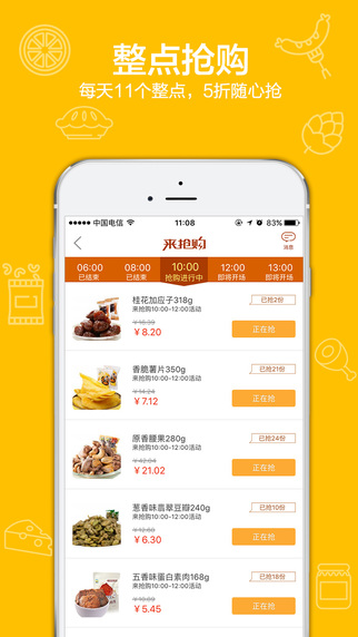 整点【来抢购】低至5折,想吃不要错过哦;抢购时段覆盖全天,商品种类丰富,折扣力度大,建议提前收藏心仪商品,设置闹钟提醒,确保不错过任何优惠机会。