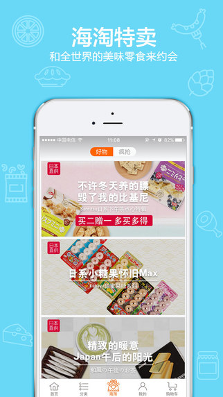 海淘特卖:进口零食抢鲜品尝,尽享全球美食;精选来自日本、韩国、欧美等地的特色零食,让您足不出户就能品尝到世界各地的美味,满足您的猎奇心理。