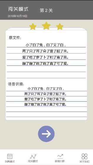 2、易上手的操作,完成关卡历险体验最火爆的绕口令挑战,难度等级逐渐提升,你还能说清楚话吗?游戏采用极简UI设计,一键即可开始挑战。系统会根据玩家表现智能调整难度曲线,确保既不会太简单而无聊,也不会太难而挫败。特别设计的"舌头保护"模式,会在玩家连续挑战时提醒休息。