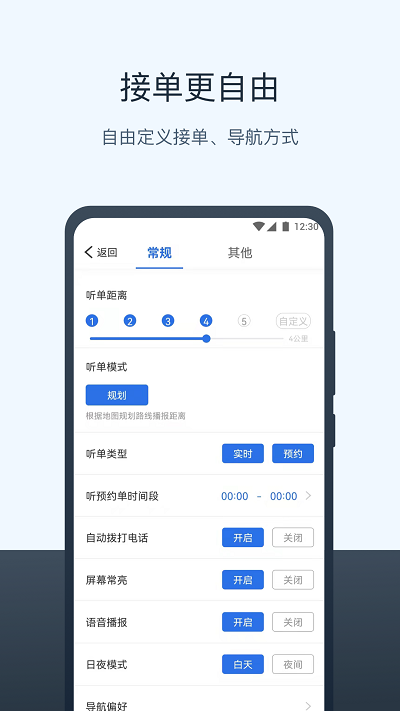 1、支持预约接单功能设置,选择后系统将优先匹配预约订单,满足司机的个性化需求;