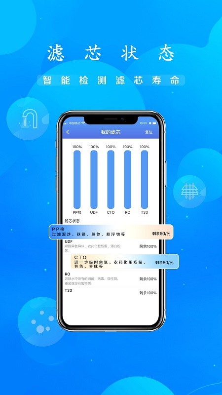 智能监测滤芯寿命,提供滤芯更换提醒;在线查询流量,剩余天数,用户可在线充值,在线报装报修等功能,支持多种支付方式一键完成交易。