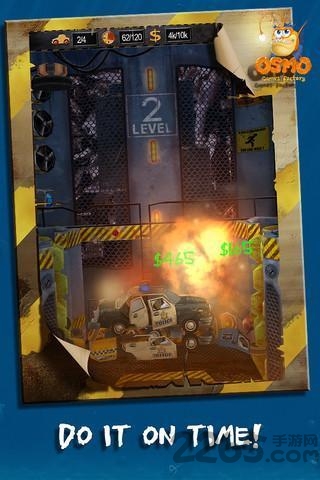 2、进入游戏,点击长按控制车辆左右移动。操作采用重力感应与触控双模式,玩家可根据习惯在设置中调整灵敏度。特别注意路面上的加速带和跳跃板,它们能帮助你获得更高的破坏动能。