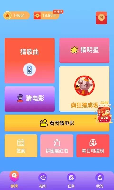 集福卡活动:用户可以抽取五福卡或金币,集齐福牛卡即可获得红包奖励,提现秒到账,每日都有机会参与,奖励源源不断。