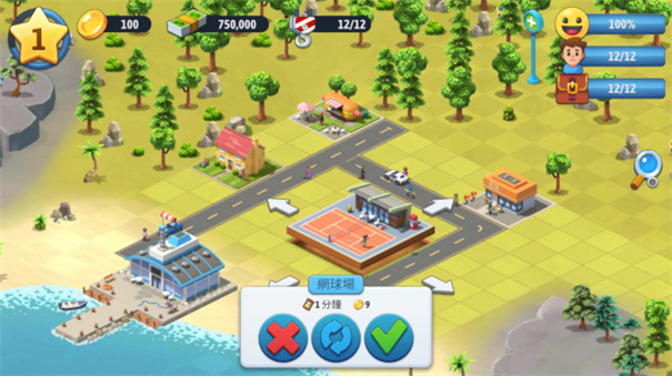特殊设施如网球场需要相邻配置休息区才能生效,系统会通过气泡提示优化建议,长按设施可查看详细收益公式。