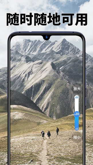 高清放大镜安卓版是一款功能强大的手机放大工具,能够实现最高60倍的放大效果。它不仅可以将手机中的图片和文档进行高清放大,还能实时放大现实世界中的各种物体、人物和风景。用户可以根据实际需求自由调节放大倍数,操作简单直观。这款应用特别适合视力不佳的中老年用户,帮助他们清晰地查看各种细节内容。同时,该应用还具备智能防抖、自动对焦等实用功能,确保放大后的画面稳定清晰。无论是阅读药品说明书、查看地图,还是欣赏艺术品细节,都能轻松应对。