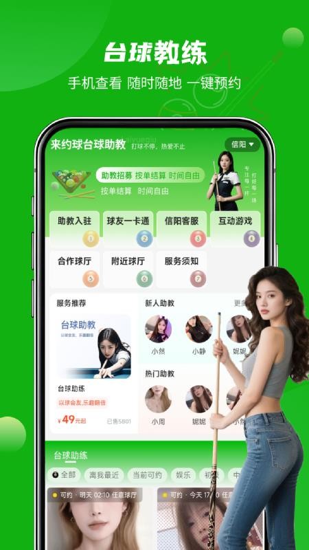 来约球台球助教app官方版是一款专为台球爱好者打造的智能预约平台,致力于为用户提供便捷、高效的台球助教预约服务。无论你是初学者想要系统学习台球技巧,还是资深玩家希望提升竞技水平,这款app都能满足你的需求。平台汇聚了全国各地经验丰富的台球助教,涵盖不同风格、不同价位的专业教练,让你可以根据自身水平和预算轻松找到最适合的指导老师。