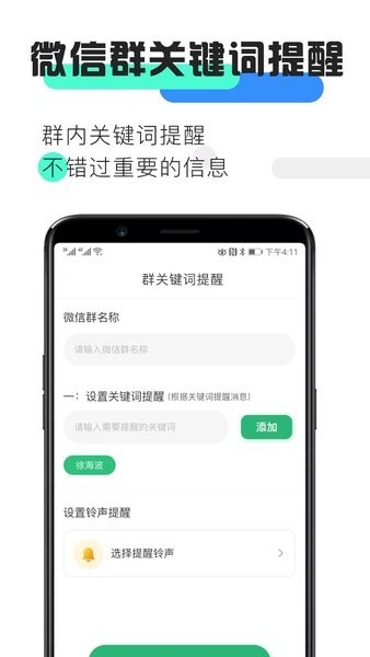消息提醒手机软件让手机像一样能够为特别关注的朋友订制铃声。一对一聊天微信群都适用!内置丰富的铃声库,支持本地音乐导入,让重要联系人的消息提醒更具辨识度。