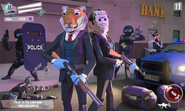 支持4人联机合作模式,团队需分工完成侦查、驾驶、爆破等专业任务。独创的"犯罪蓝图"系统允许预先规划逃跑路线,实时通讯系统支持语音指挥,完美还原真实劫案的全流程。